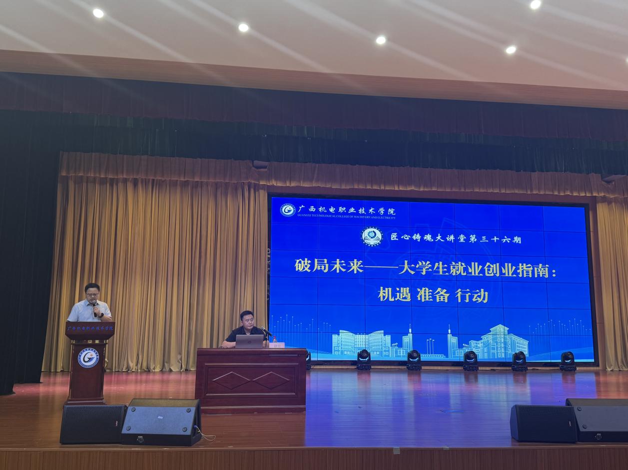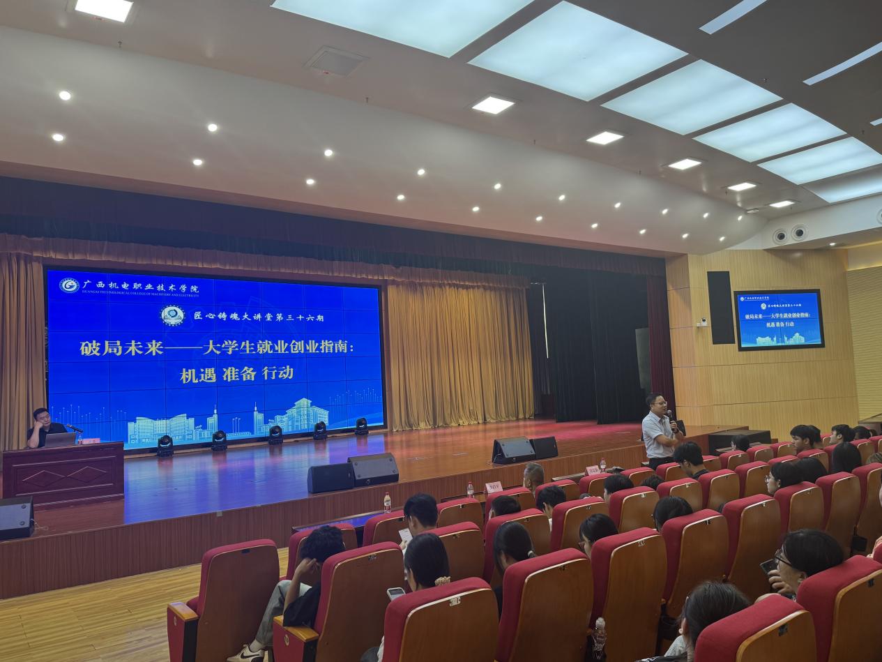 本次报告会特邀优秀校友谢贵作题为《破局未来——大学生就业创业指南:机遇·准备·行动》的专题报告。谢贵系建筑智能化工程技术专业楼宇0901班的优秀毕业生,现为南宁轨道交通运营有限公司门梯高级工,曾获“广西技术能手”“全国轨道交通行业维修能手”等荣誉称号。他结合自身从基层技术员到安全管理负责人的职业成长历程,与在场师生分享了宝贵的职业发展经验。