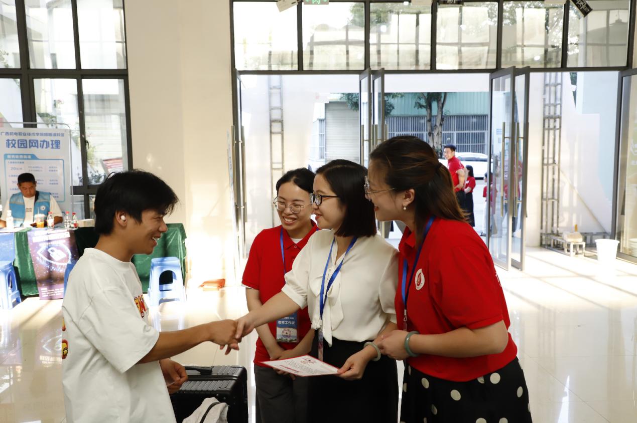 在明理楼一楼大厅,由学院领导、辅导员、学生志愿者、辅导员助理组成的迎新工作团队,全程引导新生办理入学手续,核对报到信息,发放校园卡、新生礼物等,各项流程有序不紊。“学院的服务特别贴心,每个环节都有学长学姐热情的接待引导。我期待在大学东路101号开启我的大学生活。”来自2025级供热通风与空调工程技术专业的新生说道。
