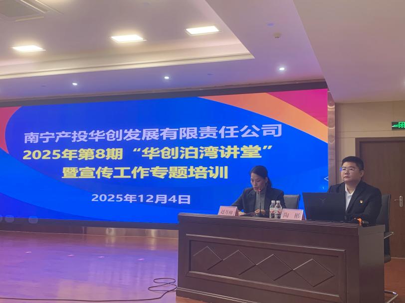 为深入学习贯彻党的二十届四中全会精神,积极探索校企合作党建共建联建促高质量发展新路径,12月4日,我院学生第一党支部书记、“红砖筑梦”辅导员工作室骨干成员陶彬,受邀赴南宁产投华创发展有限责任公司开展“华创泊湾讲堂”暨宣传工作专题培训,该公司领导班子、中层干部和职工共70人参加培训。
