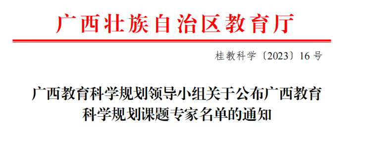 近日,广西教育科学规划领导小组发布通知,AC米兰黄政艳教授等8名教师入选广西教育科学规划课题专家库。这标志着AC米兰教师在教育科研方面的专业能力和贡献得到广西教育科学规划领导小组的认可。