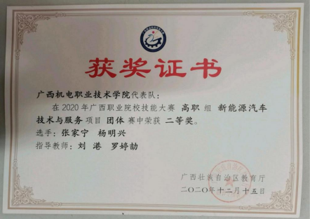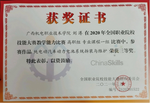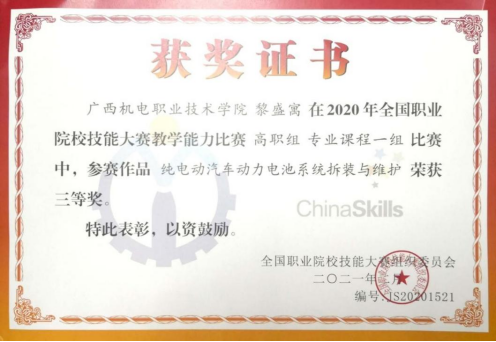 2.2020年《铸匠魂,育匠才——纯电动汽车电池系统拆装与维护》获广西职业院校教学能力大赛一等奖。