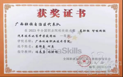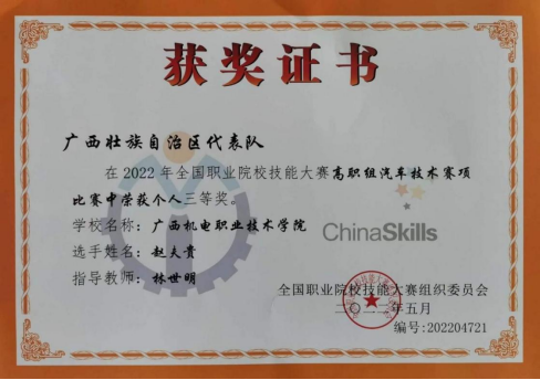 3.2022年熊继芬、孔泽慧老师指导学生参加广西职业院校技能大赛新能源汽车技术与服务赛项荣获一等奖。