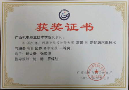 2.刘港、罗婷劼指导学生参加2021年广西职业院校技能大赛新能源汽车技术与服务赛项获一等奖。