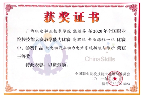 1.2021年《纯电动汽车动力电池系统拆装与维护》全国职业院校技能大赛职业院校教学能力比赛三等奖。
