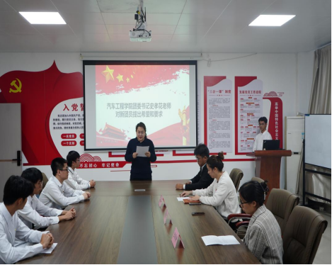 青年兴则国兴,青年强则国强。党有号召,团在行动,共青团员争做时代接班人。2024年12月6日晚上,我院在汽车工程学院1+x实训室二楼会议室举行“青春献祖国,永远跟党走”为主题的新发展团员入团仪式。此次入团仪式由周庆德同学主持,参加此次入团仪式的有汽车工程学院团委书记史孝花老师、汽车工程学院学生党支部王丽静老师、周伟一老师,以及在校的新老团员。本次入团仪式议程共有九项。