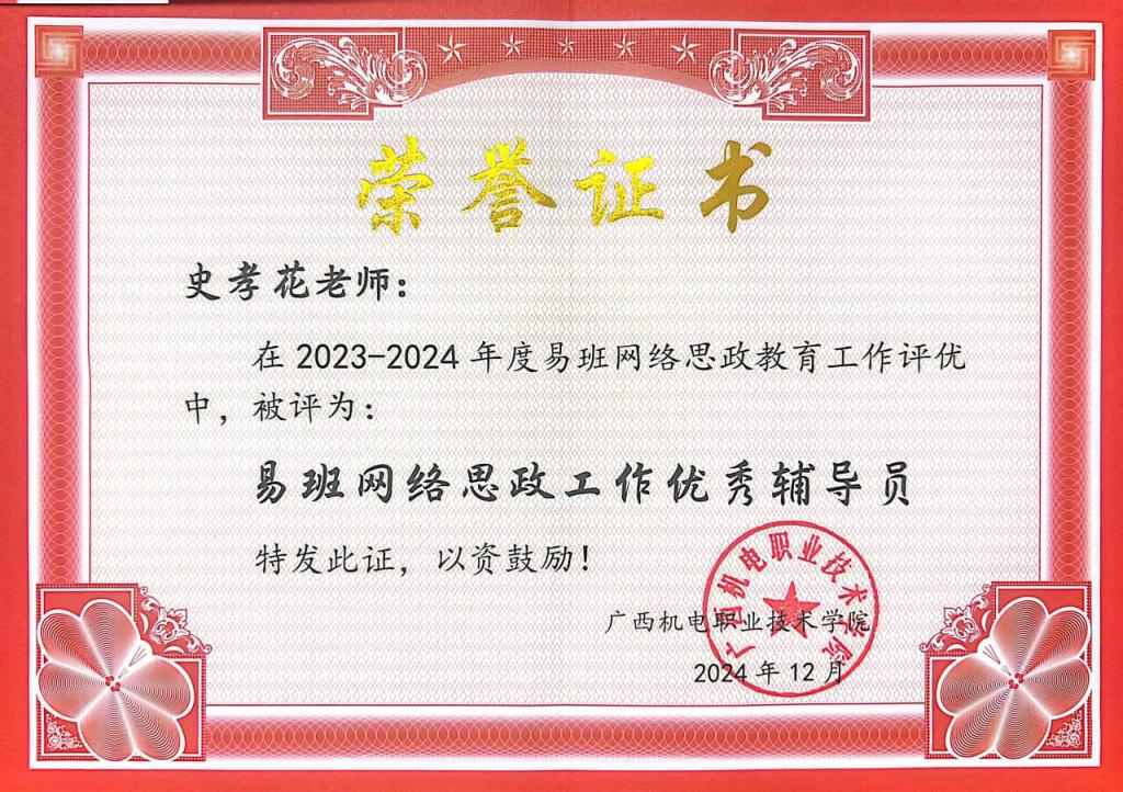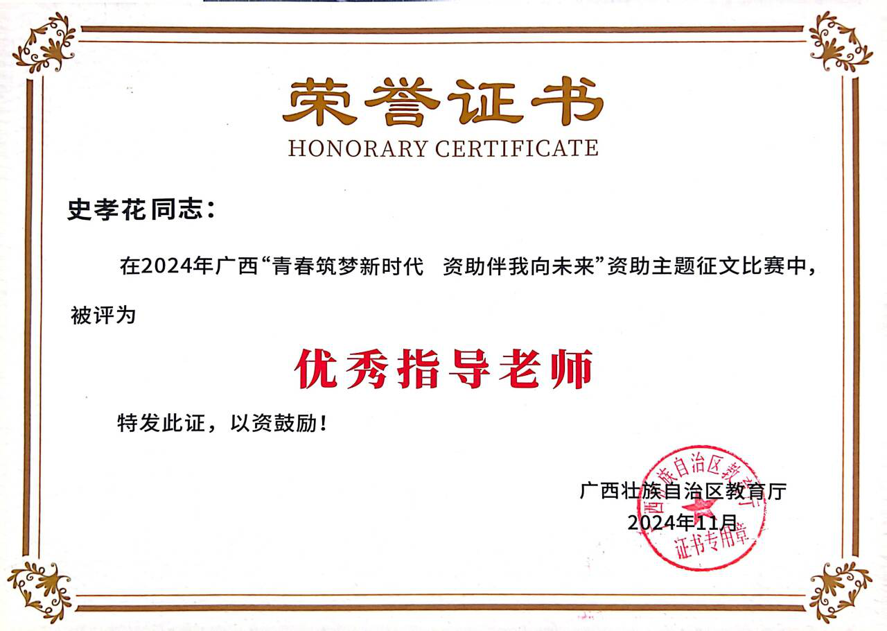 1、史孝花在2024年广西“青春筑梦新时代 资助伴我向未来”资助主题征文比赛中,被评为优秀指导老师三等奖,主办单位,广西壮族自治区教育厅。
