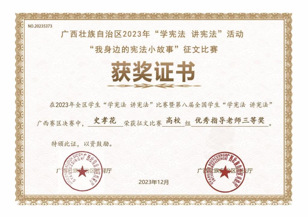 2、史孝花在2023年全区学生“学宪法 讲宪法”比赛暨第八届全国学生“学宪法 讲宪法”广西赛区决赛中,荣获征文比赛高校组优秀指导老师三等奖,主办单位,广西壮族自治区教育厅,广西壮族自治区司法厅。