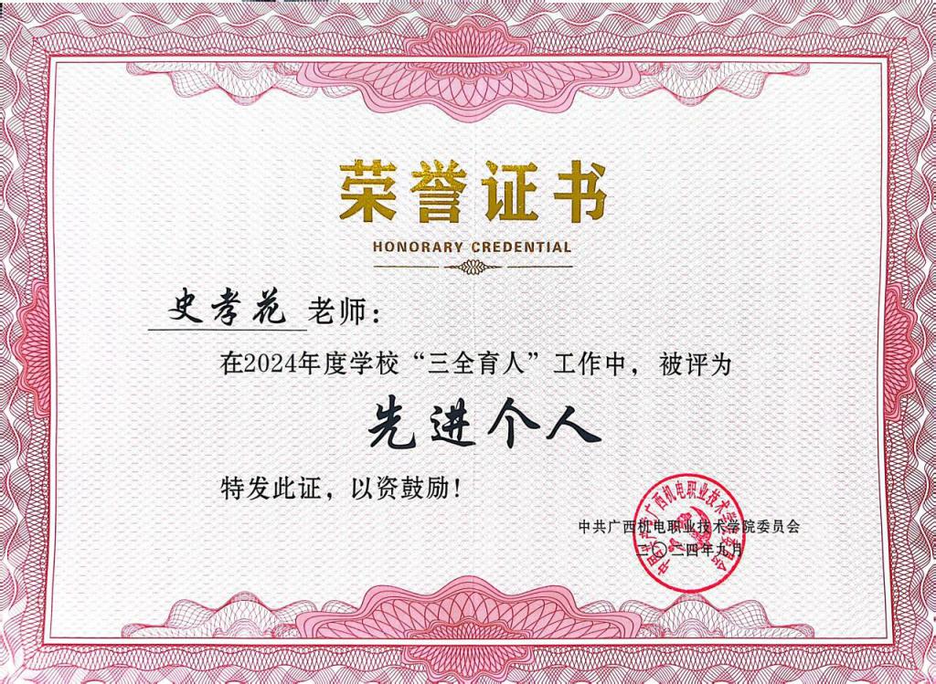 4、史孝花2024年度学校“三全育人”工作中,被评为先进个人,颁奖单位AC米兰中国官网。