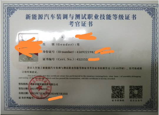 参加本次新能源汽车技术师资能力提升培训班的所有学员,在经过为期6天的培训学习,经过考试合格之后将会获取以下证书。即新能源汽车装调与测试职业技能登记证书及考官证书。