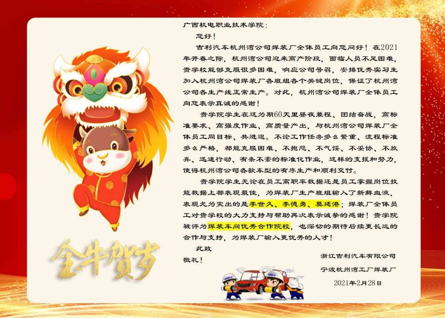 吉利汽车杭州湾公司焊装厂全体员工向您问好!在2021年开春之际,杭州湾公司迎来高产阶段,面临人员不足困难,贵学校能够克服很多困难,响应公司号召,安排优秀实习生加入杭州湾公司焊装厂各班组各个关键岗位,保证了杭州湾公司各生产线正常生产。对此,杭州湾公司焊装厂全体员工向您表示真诚的感谢!