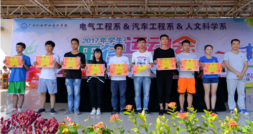 在党的第十九大胜利闭幕的喜庆日子里,赛场上全体运动员以饱满的激情,昂扬的斗志,勇于拼搏的信念,团结向上的精神投入到本届运动会中。百米跑道上,同学们如离弦之剑;一千五百米赛道上,同学们用汗水诠释了什么是坚持;跳远的沙坑前,同学们向着心中的目标奋力一跃……;在场边,拉拉队的呐喊声,助战的锣鼓声和欢呼声交织在一起,令人激动和振奋。经过了两天的激烈比赛,汽车1501班刘志华打破男子组100米系运动会记录;9个班级荣获体育道德风尚奖,9个班级获得团体总分一、二、三奖。