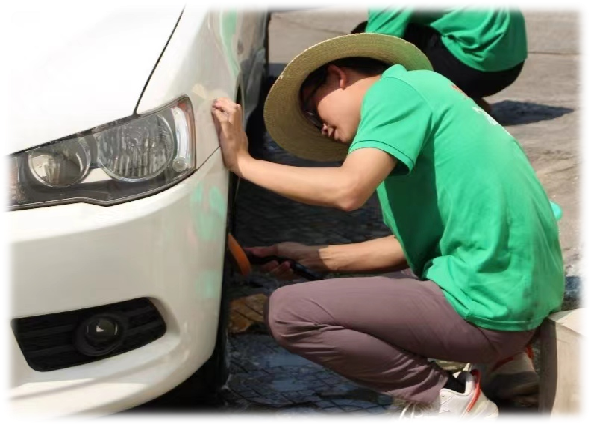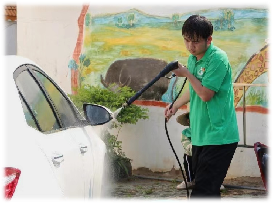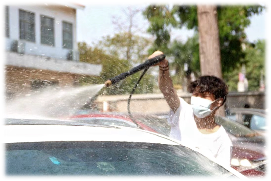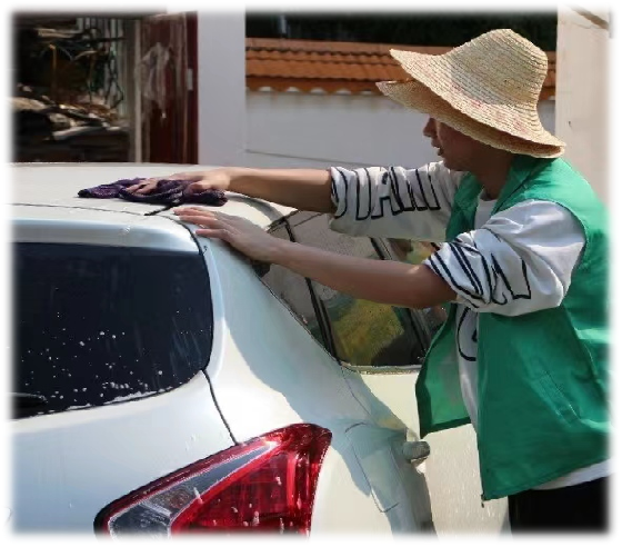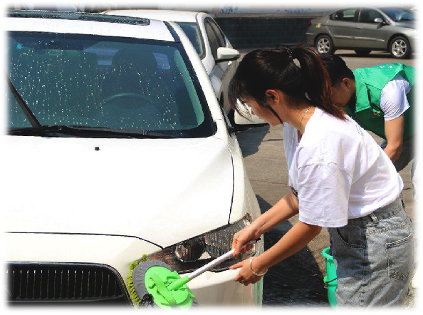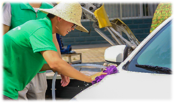 虽然烈日炎炎,但是小伙伴们依旧在认真的清洗着汽车。
