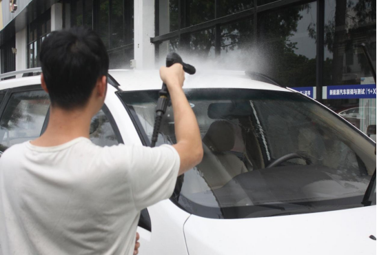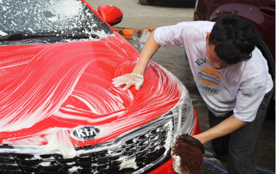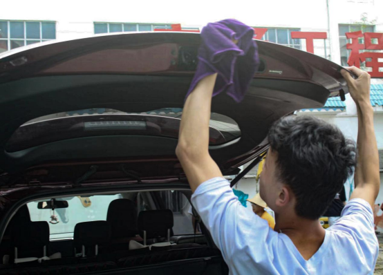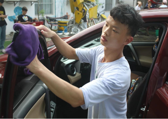 为了不放过任何卫生死角,小伙伴们对每辆车的车门车窗仔细清洗。