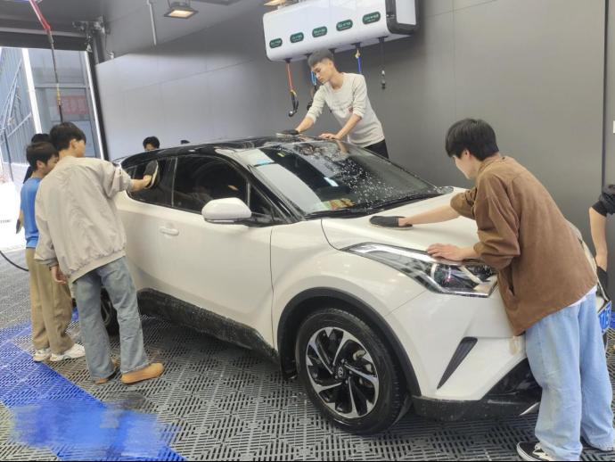 在LINGlAB五菱直营店洗车区,青年志愿者身着统一的志愿者服装,精神饱满,周到热情为今天前来洗车的老师们服务。从登记接待、车身喷水、喷洒泡沫、清洁冲洗、擦干到交付车辆,青年志愿者们在开展服务的过程中团结协作、一丝不苟、精益求精,除了提供专业的洗车服务,志愿者们还热心地向老师们介绍汽车清洁与养护的知识与技巧。这种贴心的服务让老师们感受到了青年志愿者们的真诚和关怀。在大家的努力下,三十二辆焕然一新的汽车让老师们都倍感欣喜。