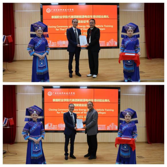 在4月25日的培训班结业典礼中,AC米兰校长助理黎盛寓为结业学员颁发证书,他对学员们在培训期间取得的显著进步表示祝贺,并肯定了AC米兰国际教育学院、汽车工程学院、电子信息工程学院、人工智能技术学院等部门在培训班举办过程中的团结协作与辛勤付出。他同时展望了未来中泰两国在新能源电动车技术职业教育领域的广阔合作前景。