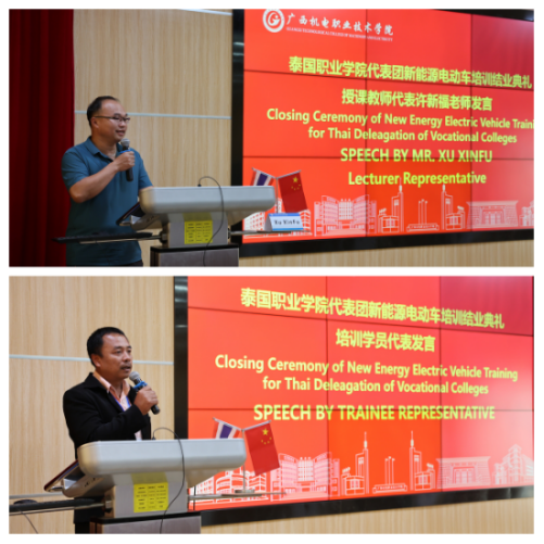 授课教师许新福及培训班学员代表分别作了发言,许新福鼓励学员们在未来的学习和工作中继续努力,不断追求卓越。学员代表在发言中表达了对学校和老师的感激之情,并表示将把所学知识和技能运用到实际工作中,努力为泰国新能源电动车技术的发展贡献自己的力量。