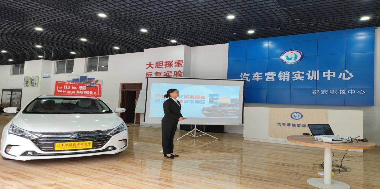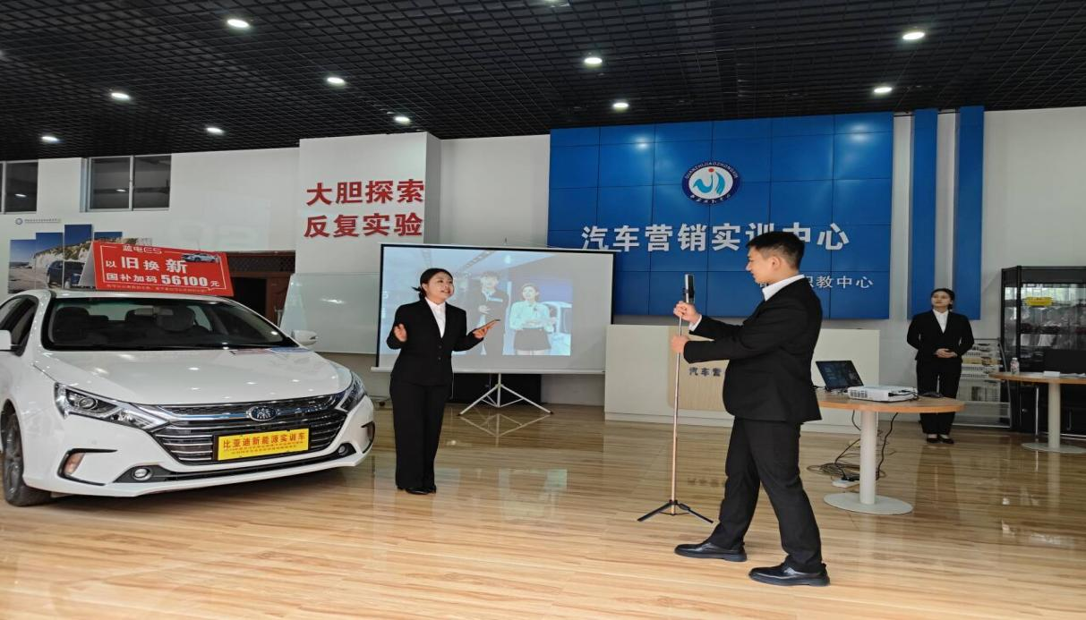 座谈会后,我院的三位同学李萌萌、陈思徽、吴文超与职教中心的50多名师生在职教中心汽车营销实训中心进行了职业技能竞赛交流展示。三位同学以“扬长补短,只为蓝电——基于数智化的蓝电E5营销策划方案”为题,分别从方案展示、现场直播演示、现场营销模拟等方面为同学们带来一场身临其境的国家级技能竞赛现场演示,让同学们对职业技能竞赛有了更深入的了解。本次交流分享,三位同学分享了自身参加国家级职业技能竞赛的经验以及心得体会,朋辈榜样的力量也激励和鼓舞职教中心的同学们积极学习、努力备赛、提升技能。