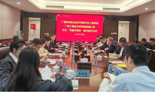 12月6日下午,我院学生第一、第二党支部赴广西工程技术研究院有限公司开展“党建共建”活动,双方就“党建共建”的具体内容进行了商定并举行了“党建共同体”结对签约仪式。出席本次活动的有我院党委副书记覃媛,党委委员、副院长徐凯、莫荣珍及学生第一、第二党支部书记、委员及学生党员代表。广西工程技术研究院有限公司党总支委员、总经理覃献军,党总支副书记、工会主席吕华健及支部书记、党员代表、机电校友代表等出席结对签约仪式。