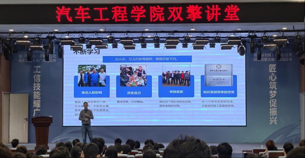 熊文建的分享引发了学生们的强烈共鸣。2025级汽车制造与实验技术专业莫同学感慨道:“熊大师的经历让我明白,职业生涯不是一蹴而就的,而是需要长期坚持和规划。他的故事让我看到了技术工人广阔的发展空间。”多名学生表示,通过这场讲座,他们对自己的职业规划有了更清晰的认识,对未来的发展道路充满了信心。