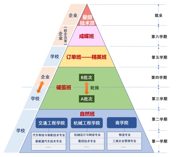 首先响应教育部“旺工淡学”的要求,通过与吉利汽车集团研讨协商,将企业实质参与专业实践教学的时间提前到第三学期,既有效解决校内实训条件艰苦的痛点,又满足了汽车制造业旺季时企业的用人需求,形成了“旺工淡学”的长效机制。