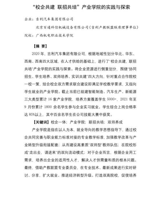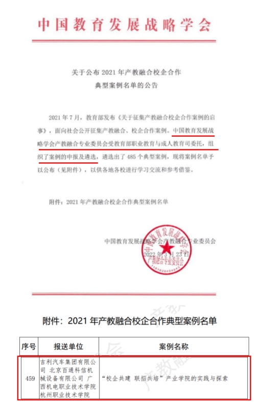 2.中国教育发展战略学会发文:AC米兰中国官网与吉利汽车集团有限公司等企业合作的案例《“校企共建 联招共培”产业学院的实践与探索》入选2021年教育部产教融合校企合作典型案例
