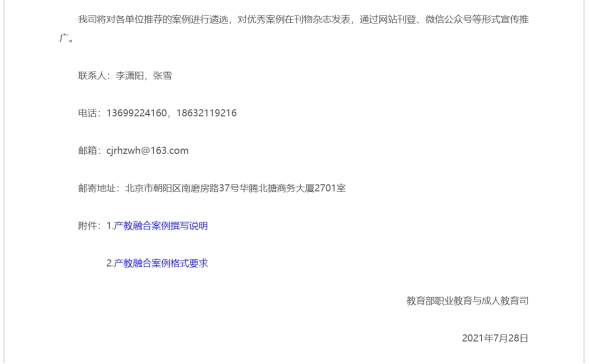 1. 教育部发文:各推荐单位于2021年9月30日前将典型案例发送至指定邮箱,纸质版邮寄至中国教育发展战略学会产教融合专业委员会。