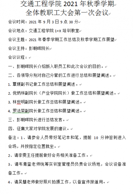 2021年9月3日9点30分,我院在新能源汽车技术1+X培训教室,召开了本学期第一次教职工大会,大会由彭朝晖院长主持,应到场参会的教职工全部到场,彭院长代表交通工程学院对大家表示衷心的感谢...