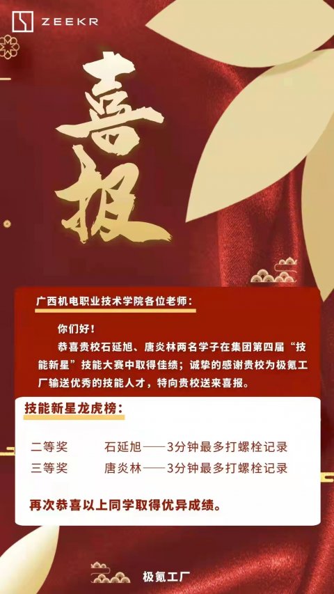 12月15日,吉利汽车集团领克梅山工厂传来喜报,吉利集团领克汽车梅山工厂于12月6日至12日开展了吉利汽车集团第四届“技能新星”大赛,搭建了以赛代练的技能平台,营造了员工比、学、赶、超的...