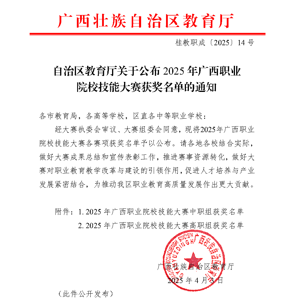 近日,广西壮族自治区教育厅公布了 2025 年广西职业院校技能大赛获奖名单,我院汽车工程学院师生凭借出色的表现,在装备制造赛道三智能网联汽车技术组\交通运输赛道汽车故障检修组\交通运输...