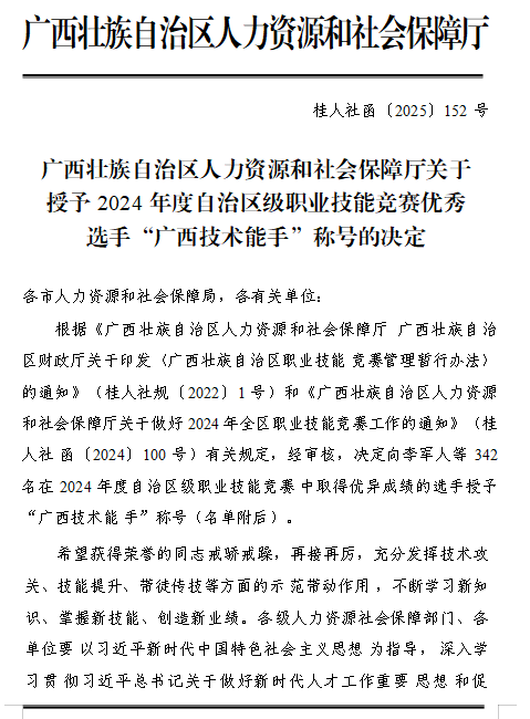 近日,广西壮族自治区人力资源和社会保障厅印发《关于授予2024年度自治区职业技能竞赛优秀选手“广西技术能手”称号的决定》。 熊继芬、孔泽慧、吴慧、韦举成四位老师凭借扎实的专业技能与突...