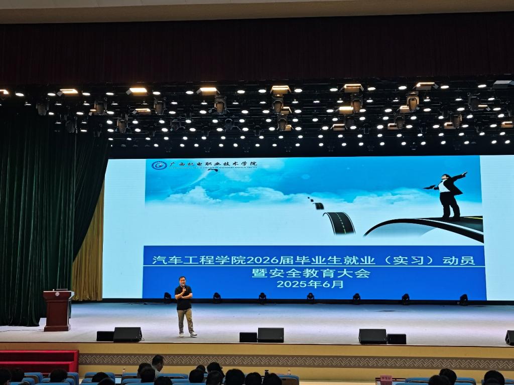 6月24日下午,汽车工程学院在弘毅楼大礼堂举办2026届毕业生就业实习动员暨安全教育大会,约900名毕业生参会,汽车工程学院党委副书记李育好、副院长徐凯和莫荣珍出席会议。2026届毕业班全体...