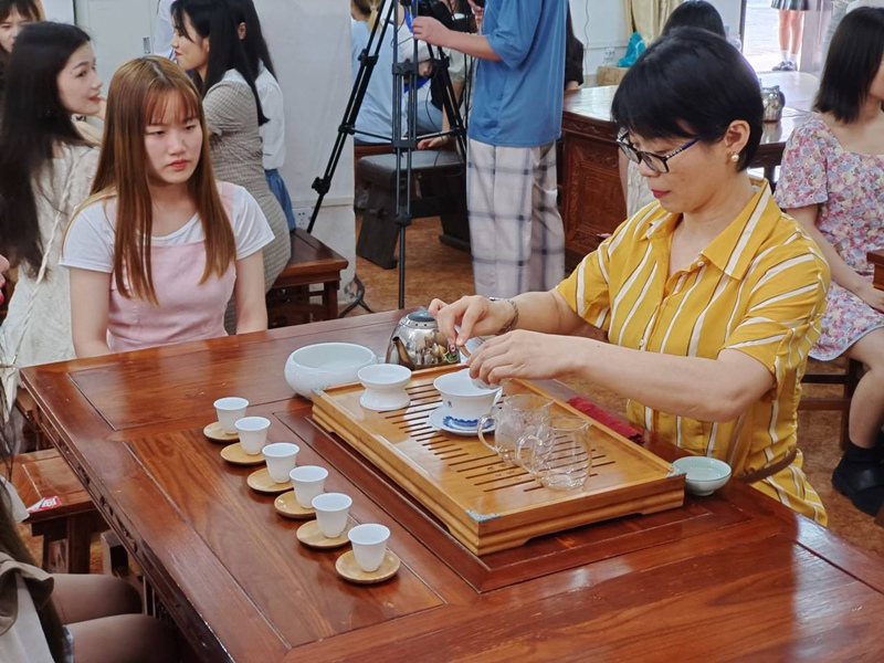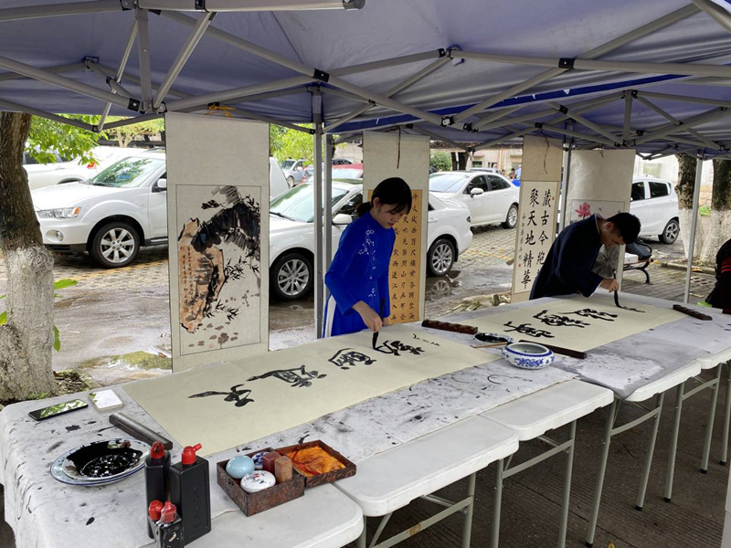 茶道体验活动活动过程中,工作人员向参加活动的学生、到访市民分别介绍了茶叶的主要种类及茶具分类。在中国传统民族乐器古筝的现场演奏中,公共管理学院学生为到场人员分别演示了红茶、绿茶、乌龙茶的冲泡技艺。随后,到场的学生与市民代表在工作人员的指导下饶有兴趣的体验了红茶的冲泡。为充分展示优秀的中华传统文化,学生现场挥毫泼墨,进行书法与中国画的展示。