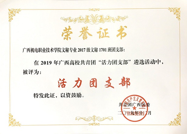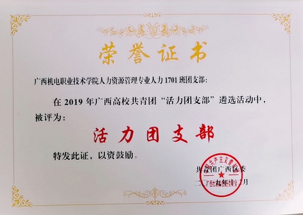 为贯彻落实《关于印发〈广西高校共青团改革实施方案〉的通知》相关精神,深入实施高校基层团支部“活力提升工程”,共青团广西区委于2019年秋季学期面向全区高校评选100个 “活力团支部”。我系文秘1701班、人力1701班两个团支部代表学院参加自治区级遴选,最终脱颖而出,获得2019年广西高校共青团“活力团支部”称号。