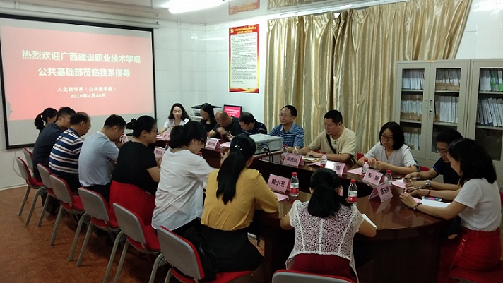 4月30日下午,广西建设职业技术学院公共基础部王振丰主任、俸洪斌副主任及相关公共基础部教师一行9人到我系考察交流。我系在系部会议室主持召开了公共课程建设与教学改革交流会。系党总支书记、主任付瑶、系党总支副书记韦世友率大学英语课程、高等数学课程、体育课程、语文课程团队教师参加了交流。