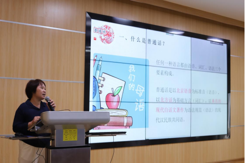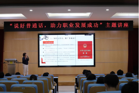 经国务院批准,自 1998 年起,每年 9 月第三周为全国推广普通话宣传周(以下简称推普周)。在全国第25届推普周到来之际,为贯彻落实全国语言文字会议精神,加大国家通用语言文字推广力度,建设共同推广普及国家通用语言文字的校园文化氛围,9月13日下午,由我院承办的推普周系列活动之“说好普通话,助力职业发展成功”主题讲座在学校第二学术报告厅举行。讲座邀请了学校图书馆吴晓明老师担任主讲,各二级学院学生分别参加了线上及线下讲座。