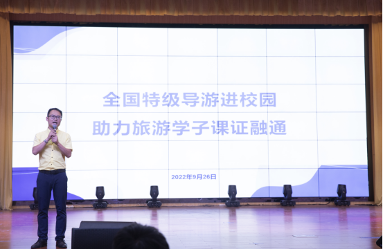 9月26日,我院旅游管理专业邀请了广西国际商务职业技术学院文化与旅游学院副院长、全国优秀导游员、国家“名导师资库师资”、国家万名旅游英才计划之技术技能大师工作室暨国家导游大师南宁工作室创始人、2020年全区旅游行业领军人物、广西首位全国特级导游黄志康为旅游管理专业的同学做了一场主题为“全国特级导游进校园,助力旅游学子课证融通”的专题讲座。本次讲座由旅游管理专业负责人钟营主持,我院院长梁金凤以及旅游管理专业全体师生参加了本次讲座。