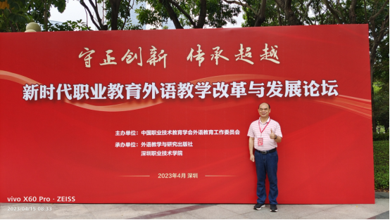 4月14日-15日我院大学英语课程团队负责人农德昌副教授应邀参加了在深圳举行的“新时代职业教育外语教学改革与发展论坛”线下会议。