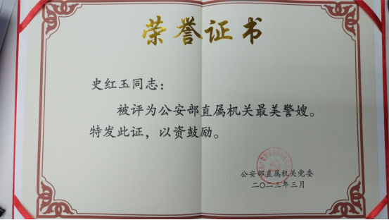 在2023年公安部直属机关党委开展的巾帼建功先进个人、巾帼文明岗、爱警母亲、最美警嫂和最美警察家庭评选活动中,我院教师史红玉荣获“最美警嫂”称号。