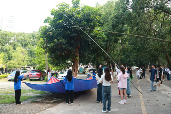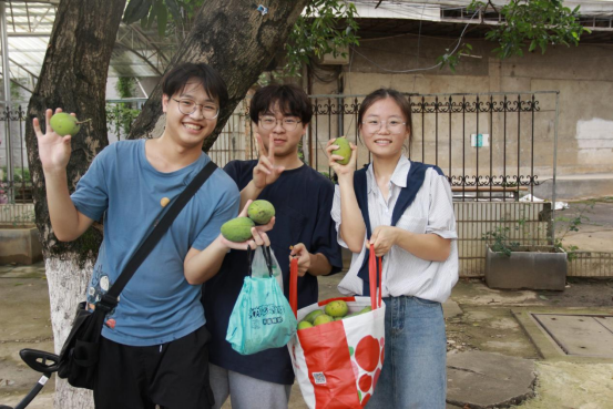 采摘活动开始前,学生党支部书记陈丽婷老师为报名担任主摘手的50名同学开展了采摘活动安全教育,并为同学们分发头盔、一次性雨衣等防护工具。活动现场,同学们有的化身手工达人,现场制作采摘神器,有的挥舞竹竿,将枝头的芒果打落;有的拉起篷布,随时准备接住掉落的芒果;有的负责装筐,有的负责搬运,有的负责分发,整个过程分工明确,配合默契,采摘现场热情高涨,一片欢声笑语。活动结束后,我院团委学生会学生干部主动清扫采摘区域。