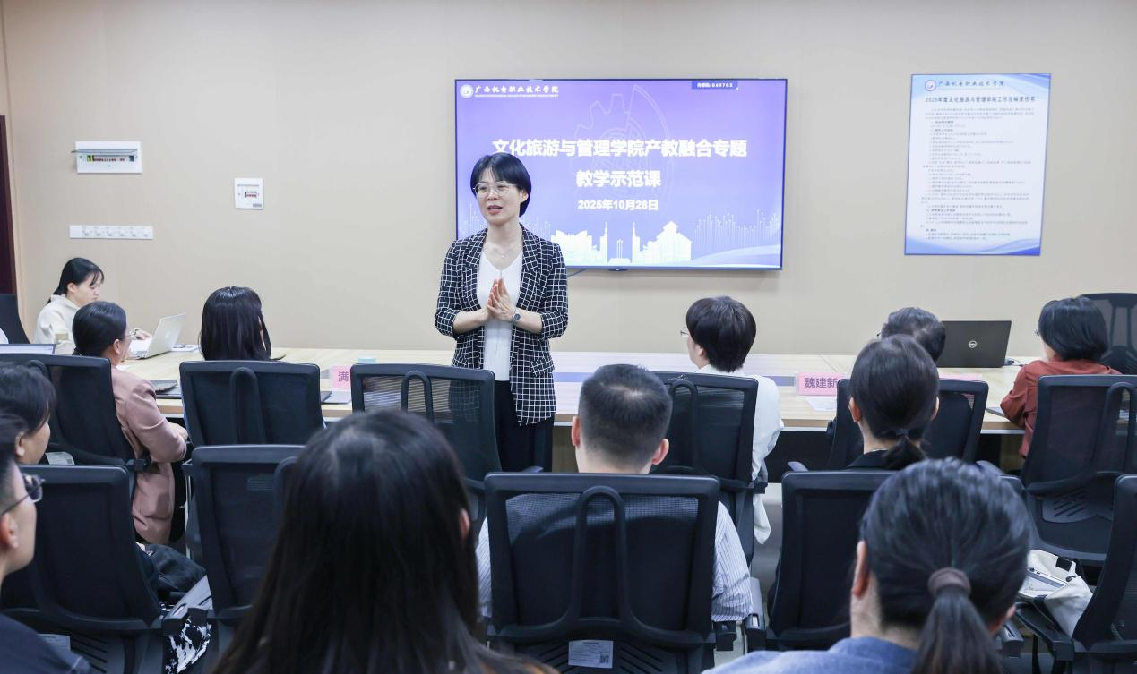 产教融合是推动职业教育高质量发展的关键路径。中共中央办公厅、国务院办公厅印发的《关于深化现代职业教育体系建设改革的意见》明确提出,需坚持“以教促产、以产助教、产教融合。”为提高教师的实践教学能力和产教融合育人水平,响应学校教学质量文化主题活动的号召,10月28日,文化与旅游管理学院组织开展产教融合示范课说课比赛。学院党委书记黄妩、院长付瑶、学院各专业带头人、教研室主任及多位评委老师和青年教师代表共同参与观摩学习。