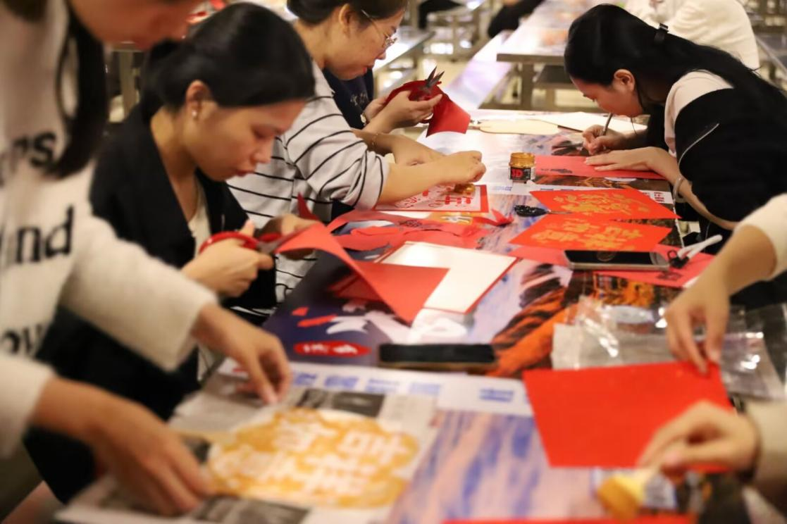 活动现场气氛热烈而温暖。同学们围坐桌前,剪红纸、绘漆扇,在一剪一画中体悟中华传统美学的独特韵味。红纸翻飞、纹样渐成,年味与文化气息在指尖流转;漆扇创作中,传统工艺与青春创意相互交融,让非遗文化在校园焕发新的活力。