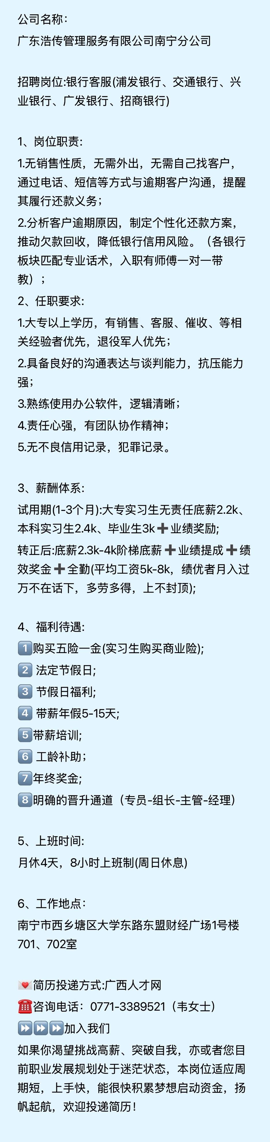 广东浩传管理服务有限公司南宁分公司招聘需求