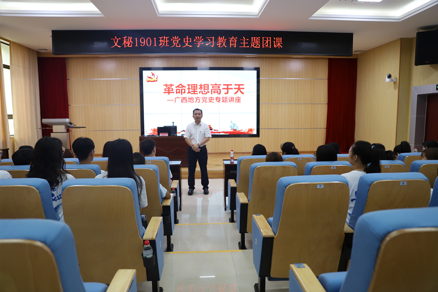 主题团课上,梁副校长为同学们做了主题为《革命理想高于天——广西地方党史》的讲座,讲述了广西党史的发展历程、代表人物、组织沿革和地位贡献、广西党史上涌现出的先进人物事迹,引导同学们认真领会习近平总书记在建党100周年庆祝大会上的讲话精神,