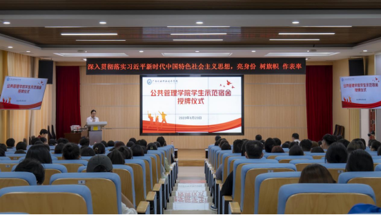 5月23日下午,学院在第二学术报告厅举行入党积极分子示范宿舍、团支书示范宿舍、优秀学生干部示范宿舍创建、授牌仪式。学校党委委员、纪委书记林华、学院党委领导班子成员参加活动并为示范宿舍授牌。授牌仪式上,学院党委书记梁金凤强调,学生示范宿舍创建是学院全体师生学习贯彻习近平新时代中国特色社会主义思想主题教育的重要抓手,是深入开展“党建带团建”、推动学院“三全育人”工作走深、走实的前沿阵地。授牌仪式结束后,林华书记来到学生示范宿舍,给入党积极分子、团支书、优秀学生干部示范宿舍的同学赠送了党团建设的学习书目,并在示范宿舍与同学们开展了一场别开生面的师生读书分享会,林华书记围绕本次主题教育的背景、要求、清廉学校建设等话题与同学们进行了深入的交流。同时,还就学生宿舍管理、学生服务、学生实习、就业需求等内容开展实地调研。