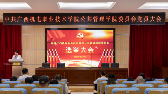 会议由党委副书记黄妩主持。大会在庄严的国歌声中拉开帷幕,会议审议并通过了上一届党总支工作报告,在充分酝酿候选人的基础上,采用差额选举、无记名投票的方式,选举产生了陈丽婷、卓倪、莫敏燕、黄妩、梁金凤(按姓氏笔画为序)等5名同志为公共管学院新一届党委委员。