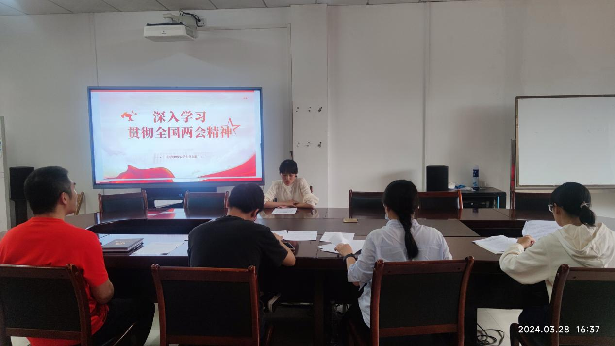 2024年3月28日,公共管理学院学生党支部组织全体成员深入学习贯彻全国两会精神,学生党支部全体成员参会,会议由支部书记陈丽婷主持。