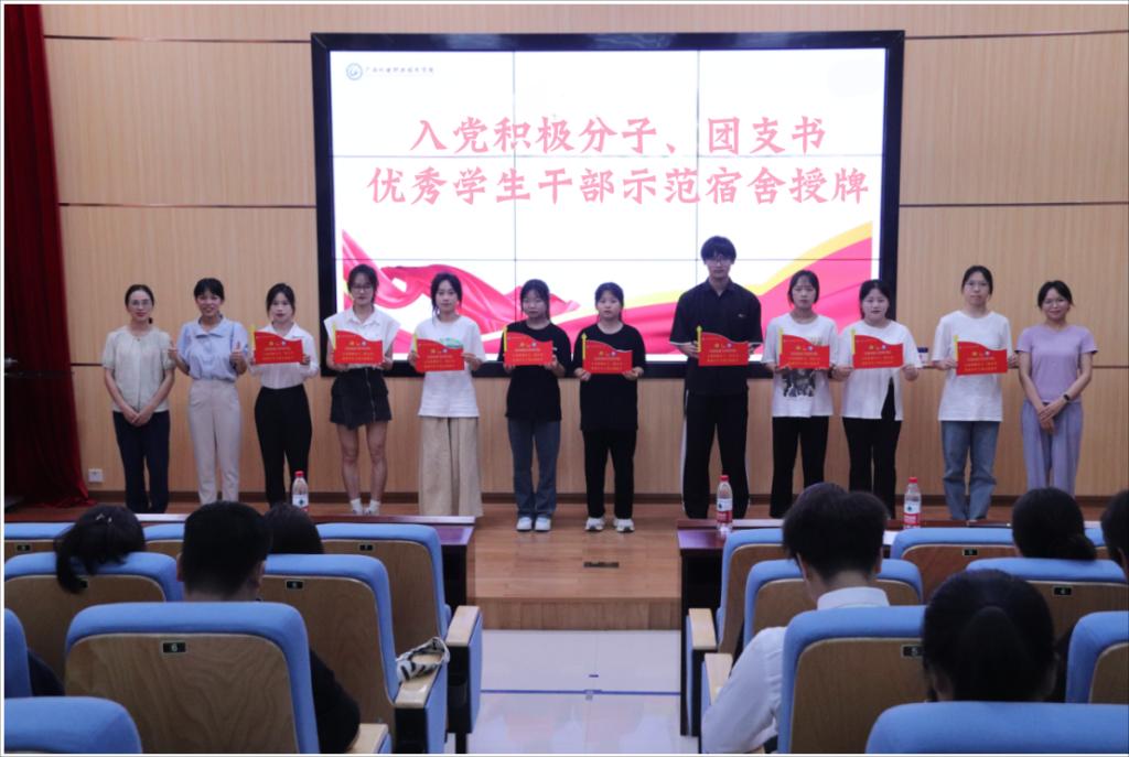 授牌仪式上,学生党支部书记陈丽婷强调,学生示范宿舍创建是深入开展“党建带团建”、拓展党建育人阵地、推动学院“三全育人”工作走深、走实的前沿阵地。希望获得授牌的入党积极分子、团支书和优秀学生干部切实增强责任感和使命感,自觉做到亮身份、当先锋、树形象、作表率。同时,她号召广大同学积极参与学院学生宿舍区文化长廊建设中,将宿舍区打造成为引领青年学生健康成长的重要阵地。