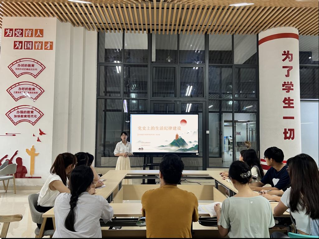 2024年6月21日上午,一场以“党史上的生活纪律建设”为主题的党课如期举行。学生第一党支部全体成员齐聚一堂,共同学习并讨论了党员在日常生活中应当遵循的行为准则,党课由支部书记陈丽婷主讲。