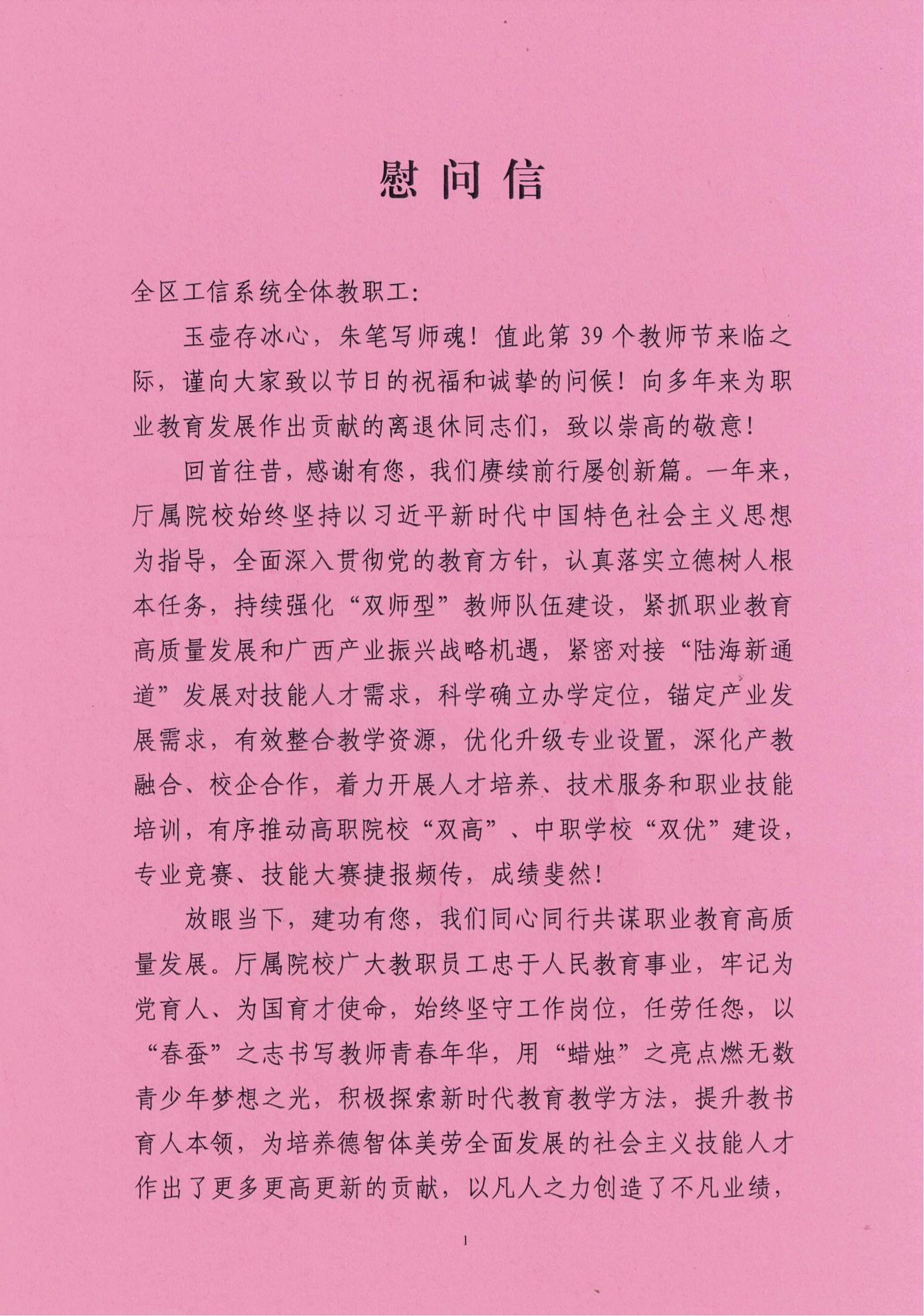 自治区工业和信息化厅致全区工信系统教职工的慰问信