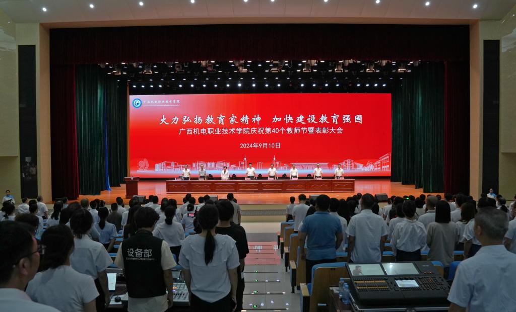 黄小敬强调,今年是习近平总书记提出“四有”好老师10周年,也是习近平总书记致信教师代表提出中国“教育家精神”1周年。今年教师节的主题是“大力弘扬教育家精神,加快建设教育强国”。我们要深刻认识教育家精神是广大教师在长期教育实践中形成的宝贵精神财富,是矢志奋斗的共同价值追求和躬耕教坛的强大精神动力,大力弘扬教育家精神,争做新时代高素质“良匠之师”。他希望全校教师要践行教育家精神,争做胸怀“国之大者”的良匠之师,争做矢志躬耕教坛的良匠之师,争做甘为学生人生出彩的良匠之师,在主动服务融入广西“一区两地一园一通道”建设和有力支撑广西新一轮工业振兴的办学实践中,加快建设广西领先、国内一流、国际知名的高水平智能制造特色校,推动学校新一轮“双高”建设再上新台阶,为实现中国式现代化广西篇章做出广西机电新的更大贡献!以优异的成绩向新中国成立75周年献礼!